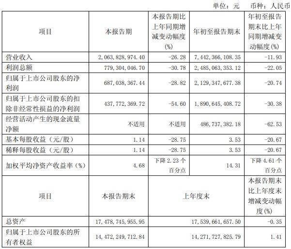 片仔癀第三季度生意收入为20.64亿元,同比下跌26.28%,包摄于上市公司鼓舞的净利润为6.87亿元,同比下跌28.82%。岁首至讲演期末,公司生意收入为74.42亿元,同比下跌11.93%,包摄于上市公司鼓舞的净利润为21.29亿元,同比下跌20.74%。