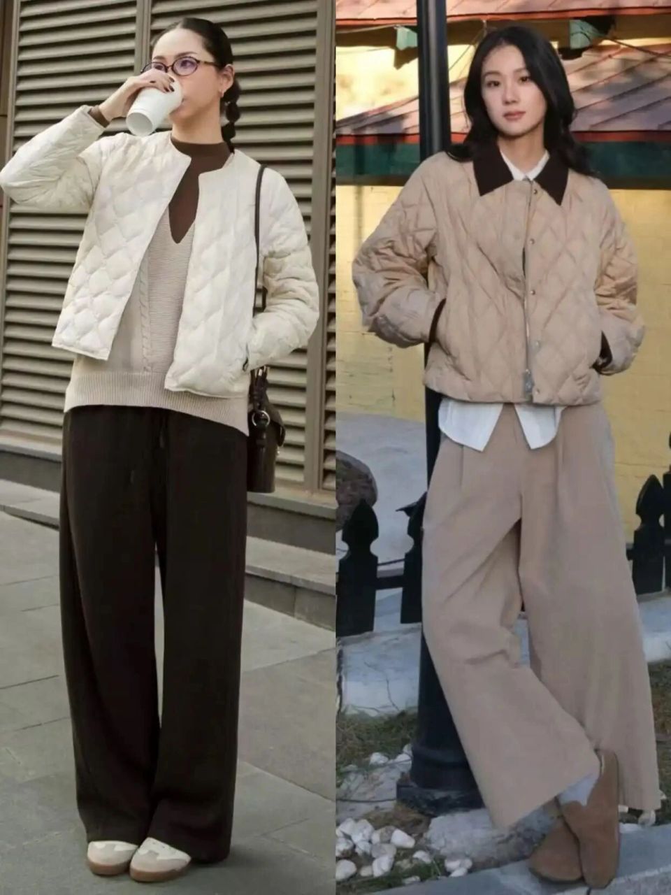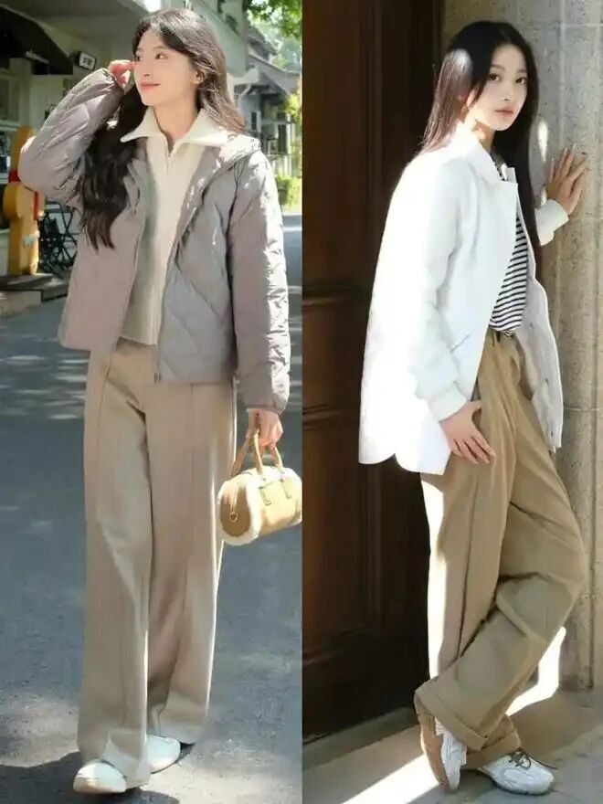 我们下半身搭配的裤子不同,呈现出来的礼貌也有很大的区别,举例上头用灰色的棉服,搭配上一条卡其色的阔腿长裤,脚上穿了一对小白鞋,这样的造型相比干练,合乎职场女性穿搭。