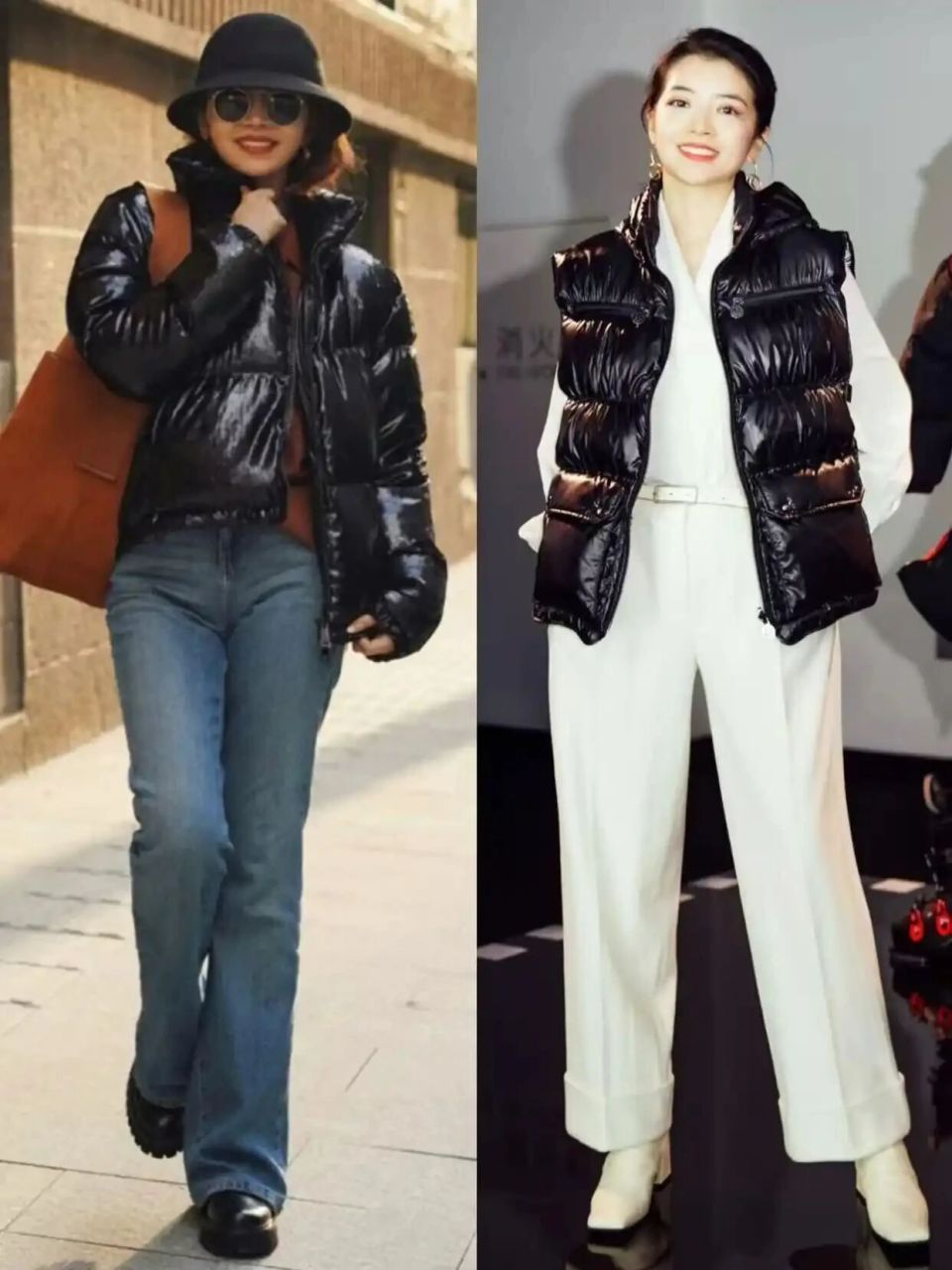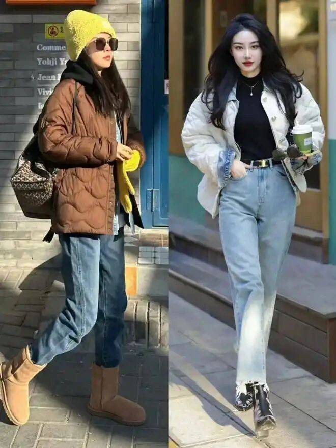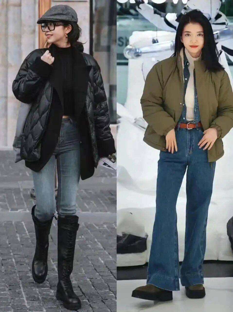 一件玄色羽绒服内搭一件玄色短款毛衣,搭配上一条经典紧身牛仔裤,这样的穿搭是属于“露脐”穿搭,能更好展现出“高腰线”。