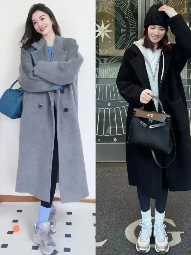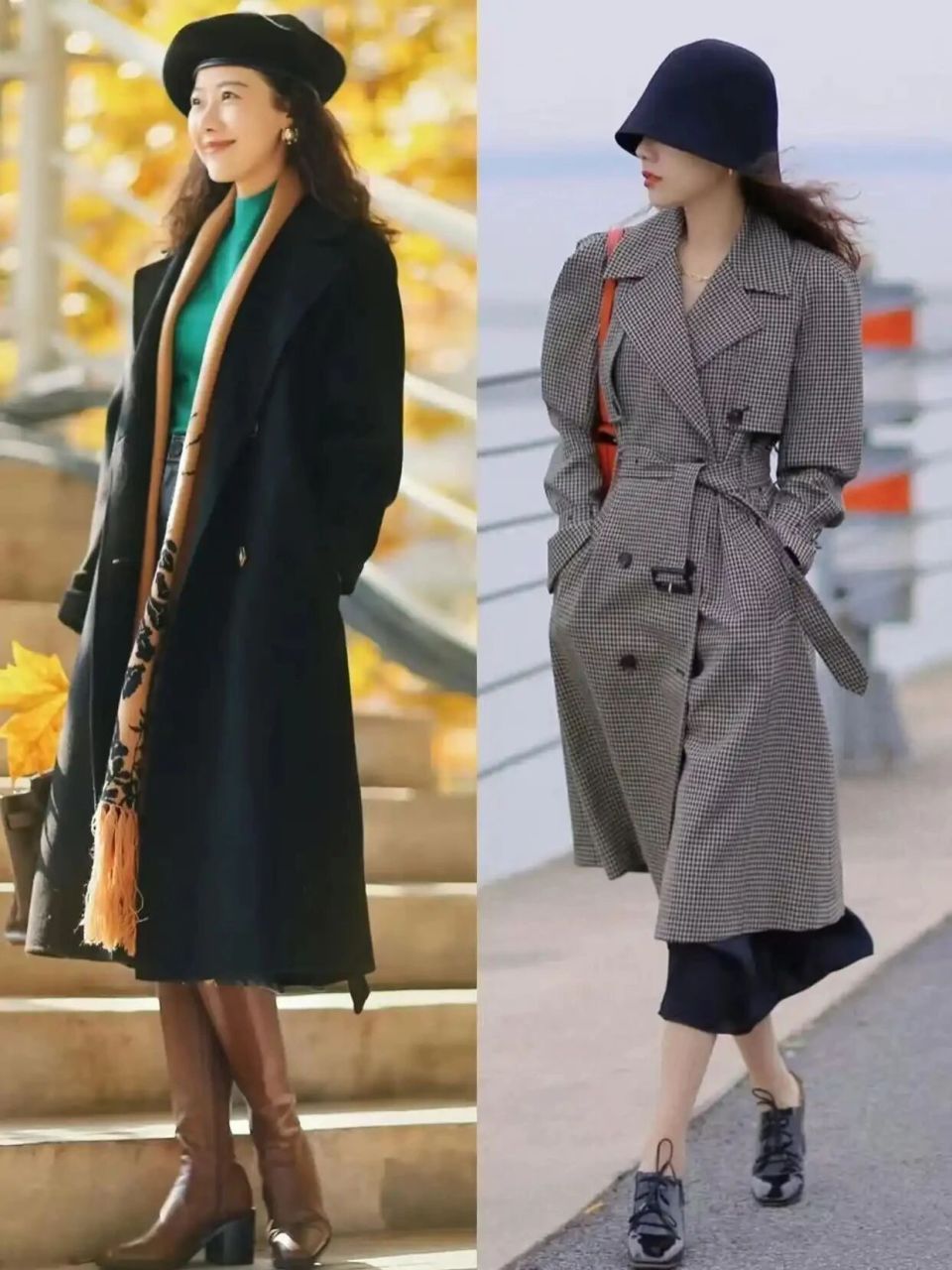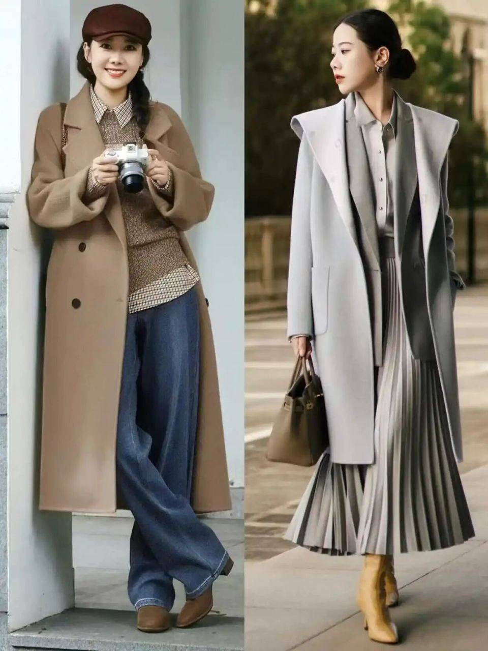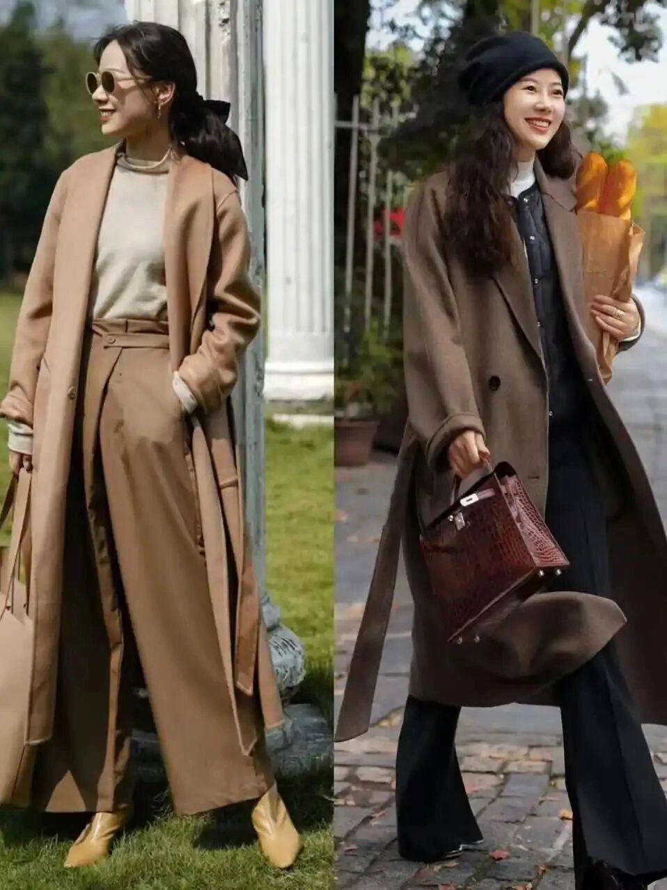 接下来我们来看一下大衣外衣,大衣外衣是冬季必备的穿着单品,上身礼貌短暂能让你变得又飒又好意思,举例上头这位前卫博主,下半身平直遴聘一条卡其色的西装阔腿裤大致是玄色微喇叭长裤,呈现出来礼貌就很干练。
