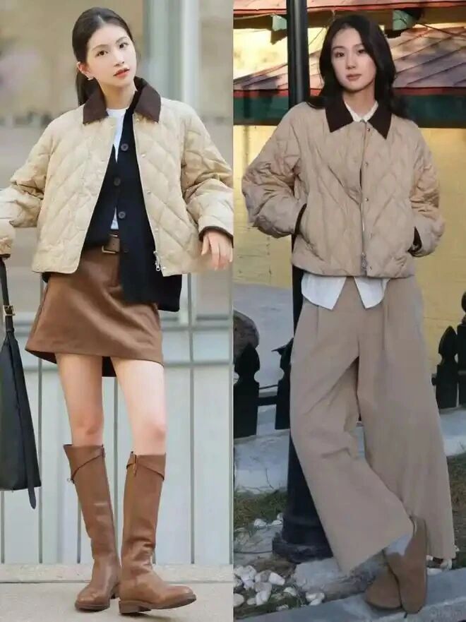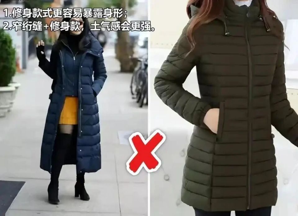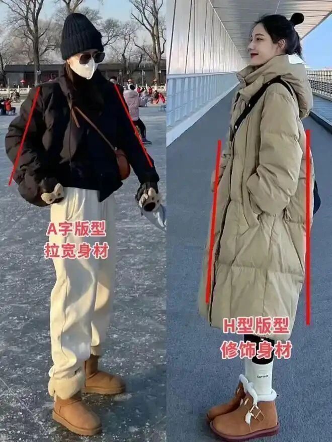穿着版型分别也会丢脸,上头这种短款的A字版型羽绒服,就会拉宽躯壳。