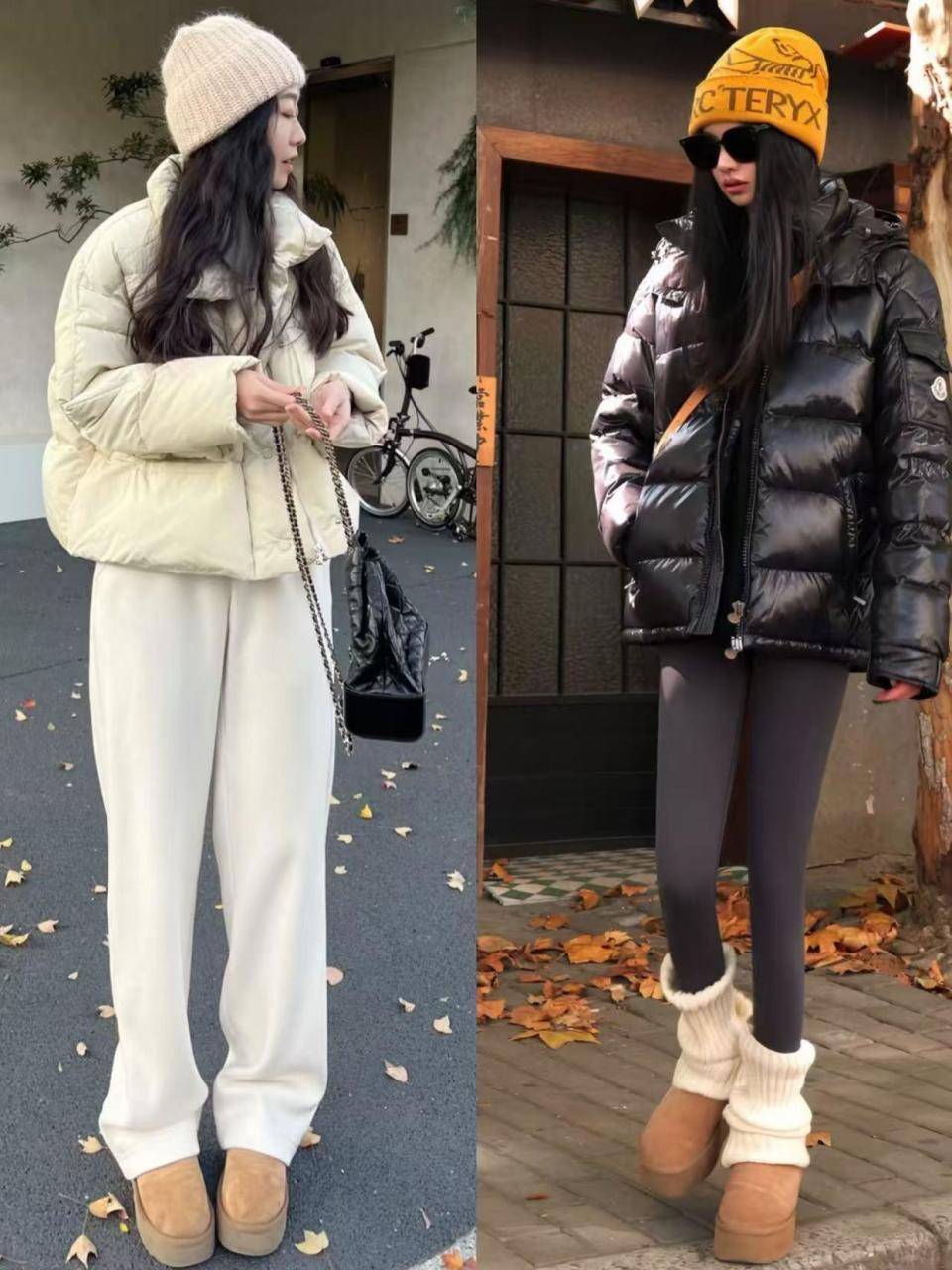 第一章节:雪地靴怎么搭配衣服色调才雅瞻念?①:灰色安静裤VS玄色无痕裤