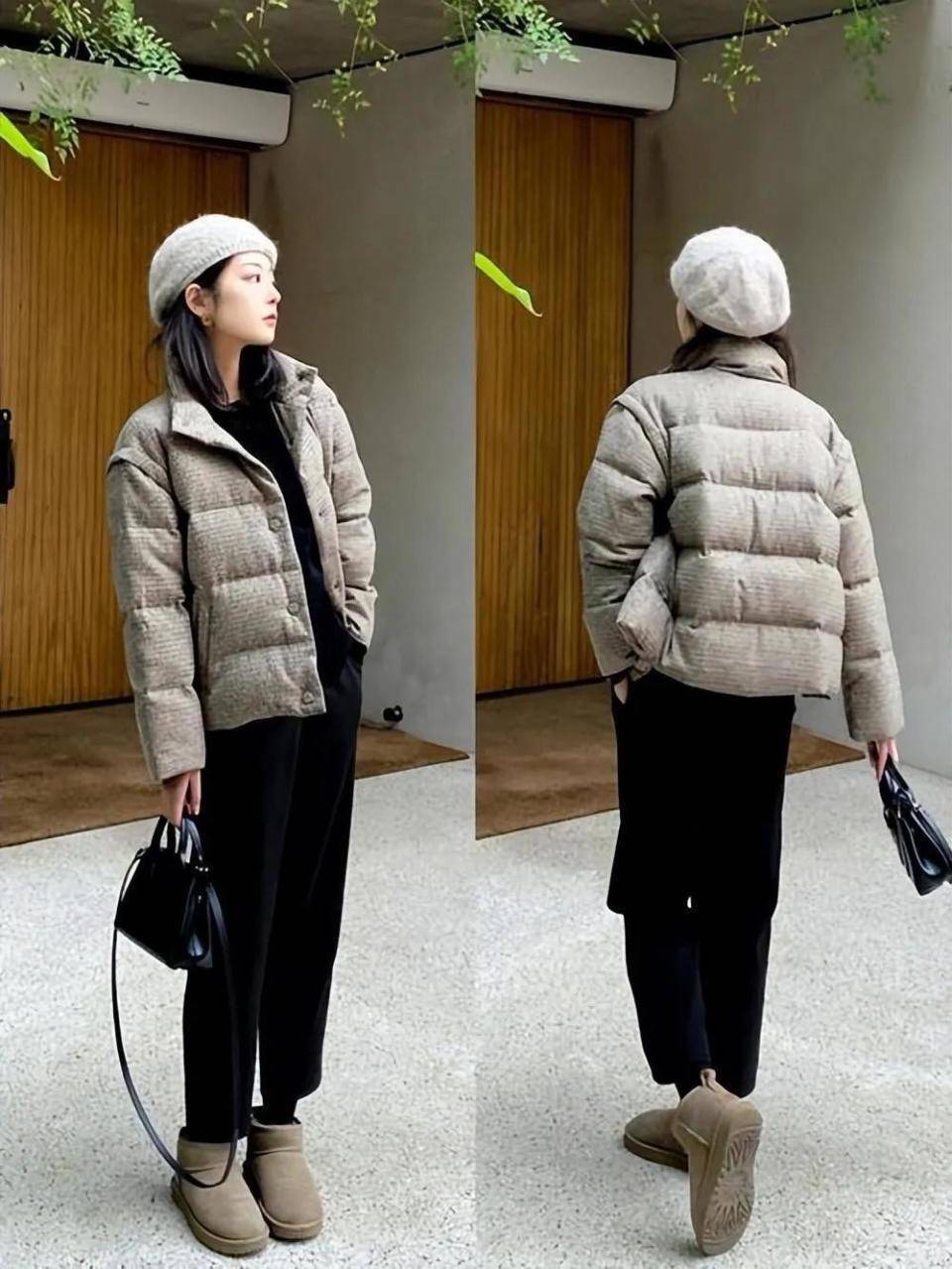 我们再戴上一款灰色的古道贝雷帽,不光能御寒,还能让造型更个性,是以说穿上雪地靴也不会影响你的气质,举例上头用灰色羽绒服搭配上玄色直筒9分裤,脚上穿的灰色的低帮雪地靴,这么的穿搭不光前锋还显瘦。