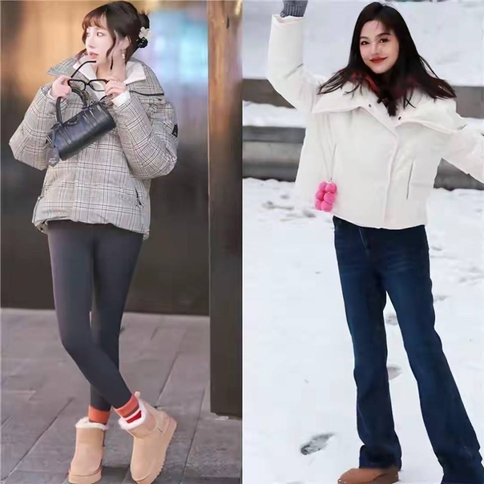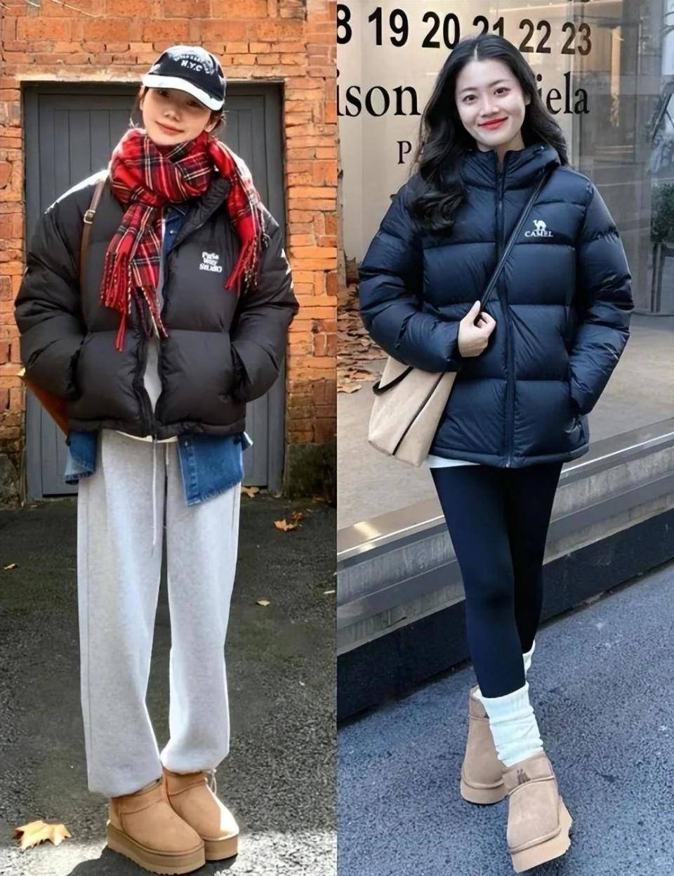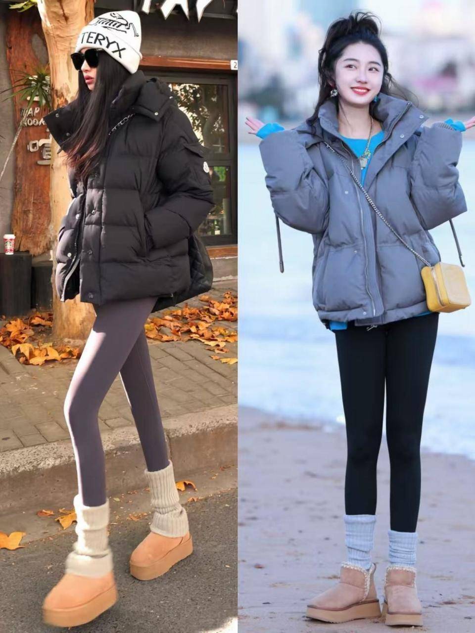 你胜利选择打底裤或者是无痕裤来搭配羽绒服外衣,脚穿雪地靴和一对堆堆袜,这么的是当下比拟流行的穿法,同期也为了更御寒。