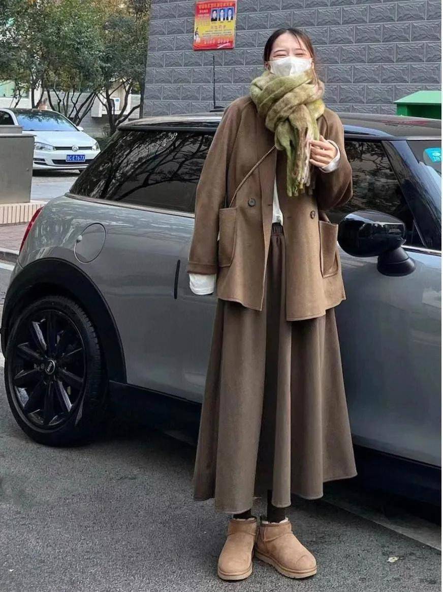 羽绒服搭配裙子和雪地靴,这么比拟优雅的,上头两套穿搭齐绝顶的御寒粗豪。