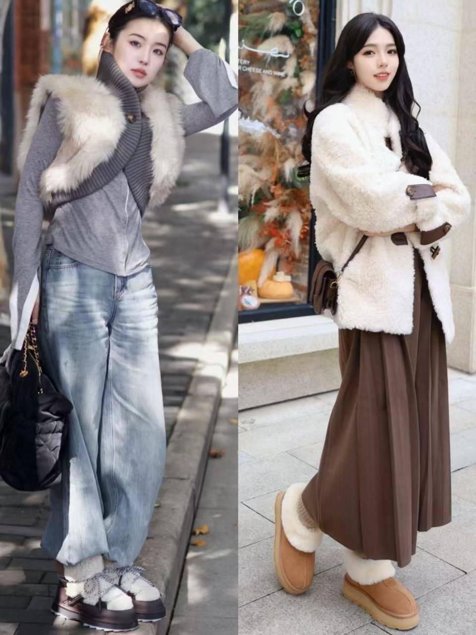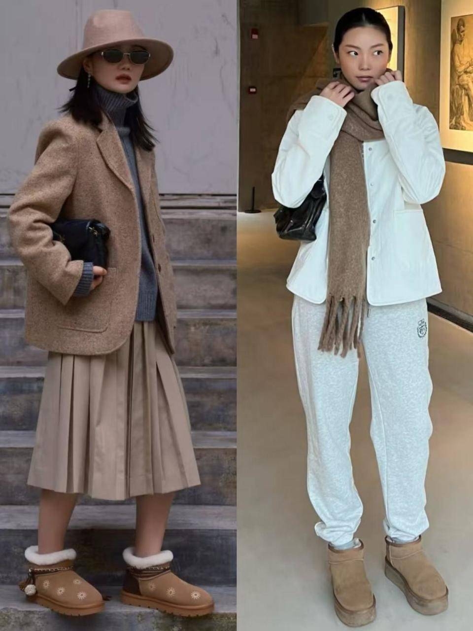 有的时分我们思要又酷又飒的造型,确乎配上雪地靴,会有点那么违和感,上头的左边这套穿搭用燕麦色的大衣,内搭灰色毛衣,加上卡其色的压褶半身裙,脚上穿的毛绒的雪地靴,头上戴的很酷的宽檐帽和墨镜,看着确乎挺雅瞻念,放在实践生存中可能不太实用,最主要的如故看个东谈主心爱。