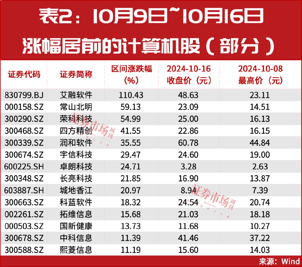 从行业来看,据梳理,在上述涨幅居前且冲破前高的个股中,计较机行业公司较多,主要触及软件开发、IT做事等宗旨,为15家(见表2)。